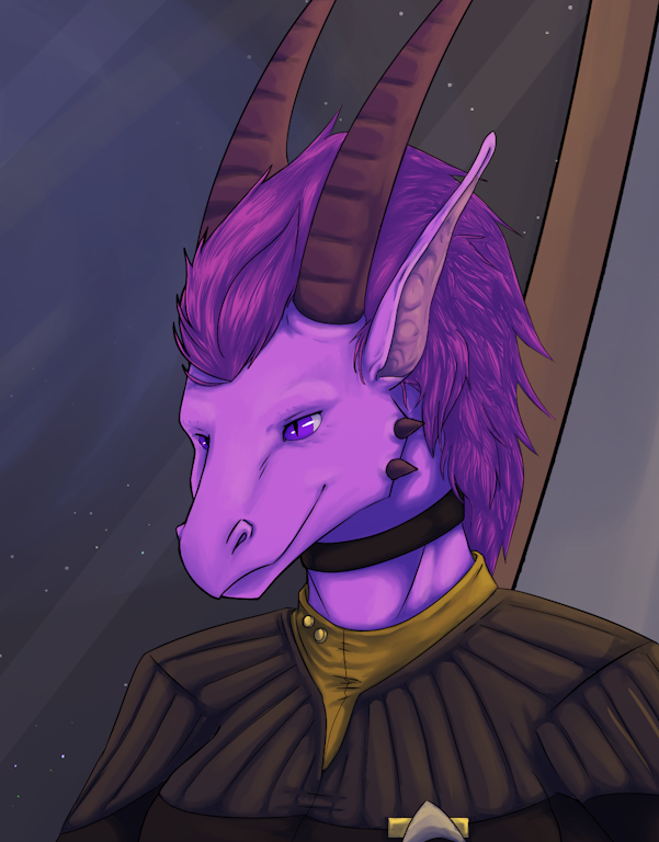 | Physical Description | Bipedal, digitigrade reptilian of moderately pale purple-lavender coloration, somewhat reminiscent of the dragons of old Earth folklore, albeit with a second pair of arms instead of wings. A narrow strip of hair, slightly darker than her scales, runs from the top of her head, between her horns, to about halfway down her neck. Her horns are about 8" long, and are filed slightly blunt for safety reasons. |